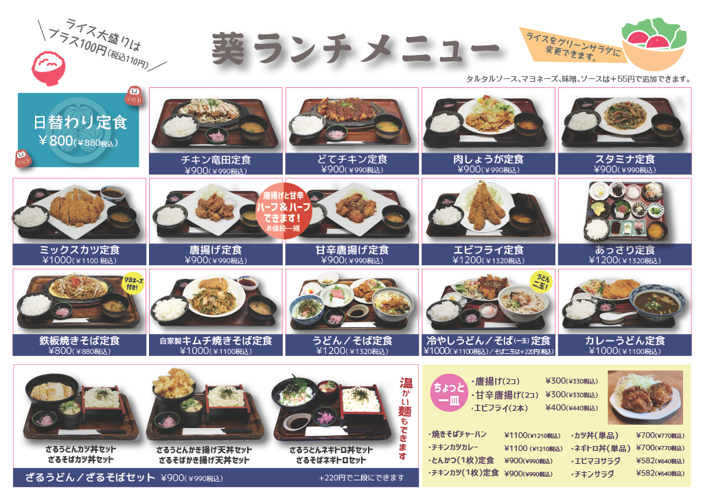 11時〜14時まではランチタイム。 「日替わりランチ」は毎日炒め物や揚げ物など2品とごはん、お味噌汁、香の物がつくお得なセット。毎日食べても飽きません。その他にも定番の「ミックスカツ定食」や「どてチキン定食」「鉄板焼きそば定食」などが人気です。 お持ち帰りもできますので店頭でもお電話予約でもお気軽に! ※2025年9月現在の価格と内容です。 予告なく変更することもありますので、店頭でご確認ください。